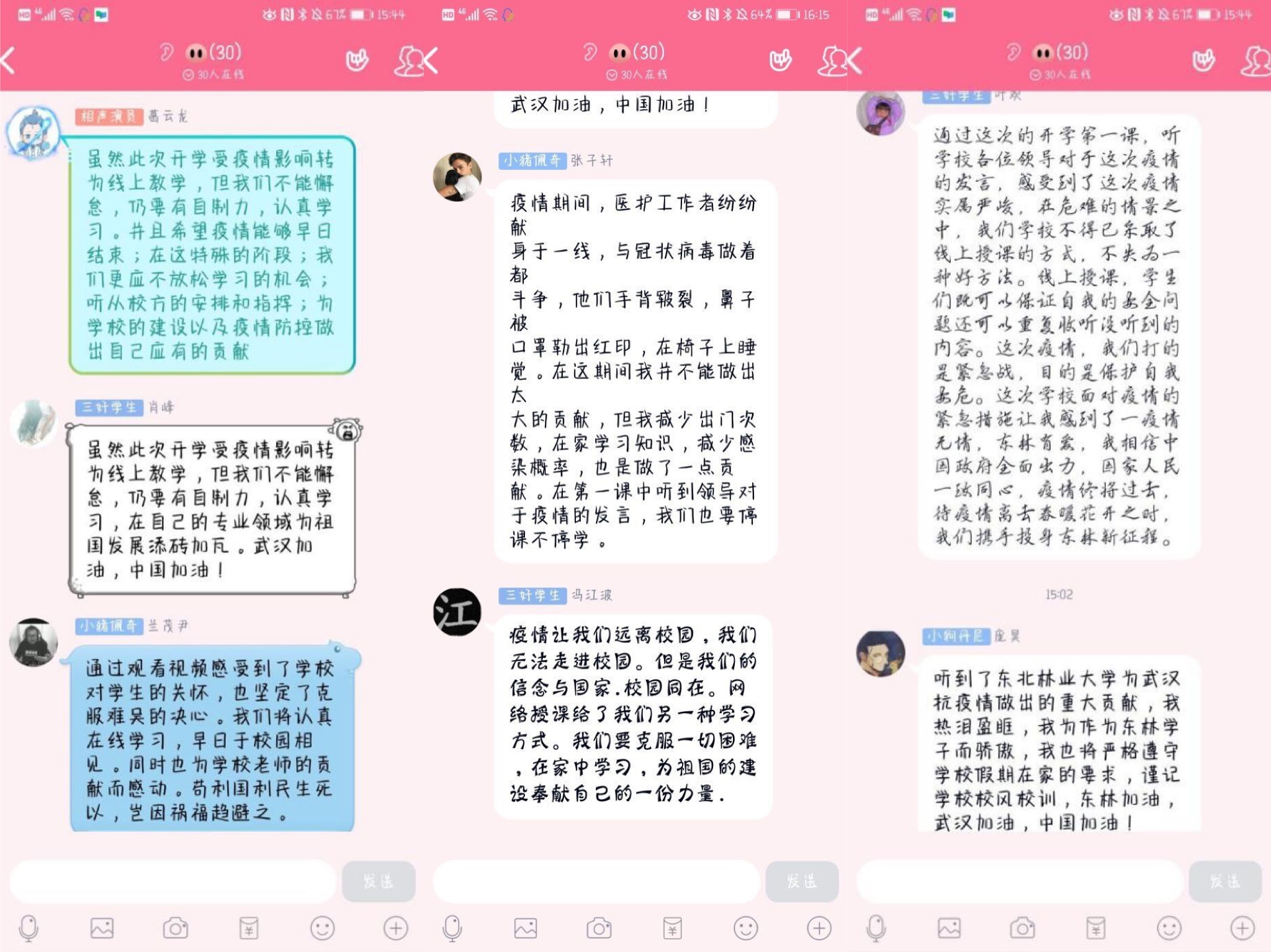 2017级电子信息工程3班郝玥琪同学说:莫道浮云终蔽日,严冬过尽绽春蕾。正逢疫情最吃劲之时,东林正以以“心有静气无难事”的定力和决心,落实好习近平总书记重要指示精神和党中央决策部署。作为信息学子,也必将担负起自己的职责,科学进行疫情防控,停课不停学,专注学习网络课程,向邱兆文老师看齐,日后为母校贡献自己的力量。让我们并肩战“疫”,共渡难关,在这大考之时,贡献信息力量、东林力量、青春力量,共同打赢这场疫情防控阻击战。