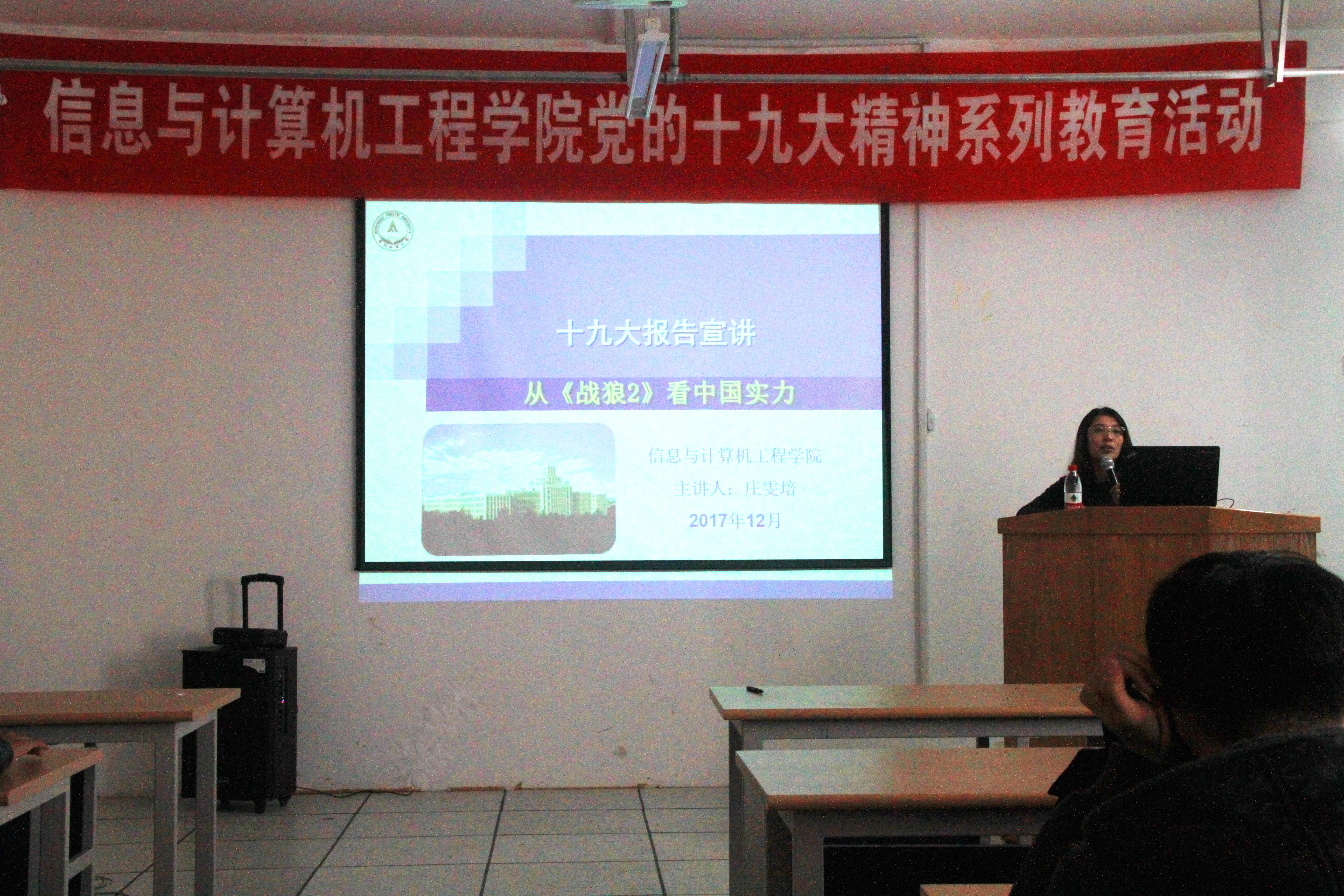 12月22日,为深入学习贯彻党的十九大精神,检验十九大精神学习阶段性效果,做到学思践悟、学以致用,信息公司举办员工干部学十九大精神专题活动。本次活动邀请到校十九大精神宣讲团成员、公司团委书记庄雯培老师作题为“从《战狼2》看中国实力”主题报告。公司全体团支部书记、班长参加了本次报告会。