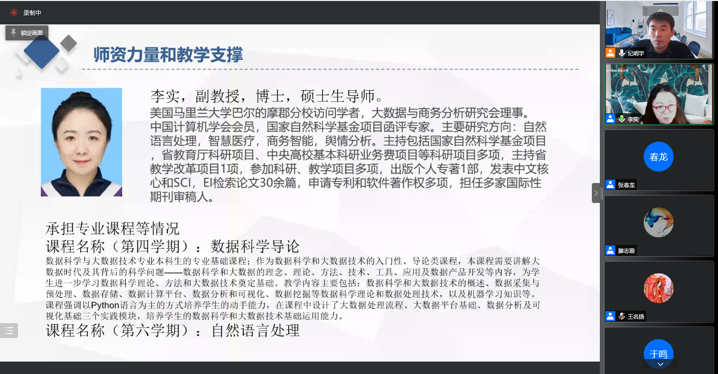 之后,专业班导师代表和任课教师代表分别发言。王名扬老师作为班导师代表,通过平易近人的话语对自己的研究方向、科研成果、授课内容进行了简要说明,作为班导师她鼓励同学们合理规划时间,通过努力实现自己的梦想。李实老师、于鸣老师、纪明宇老师先后对下学期自己所讲授的专业课程的教学内容、能力要求、教材资源等进行了细致的讲解。纪明宇老师还对今天未能线上参会的老师的基本情况和授课情况进行了介绍。