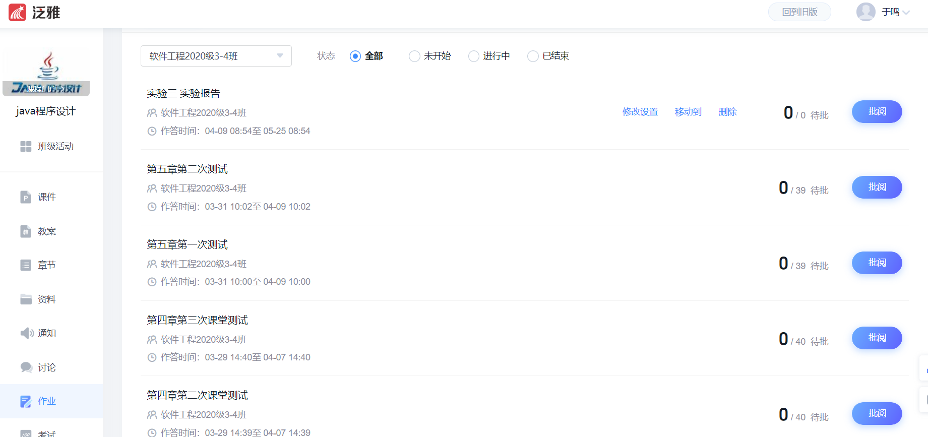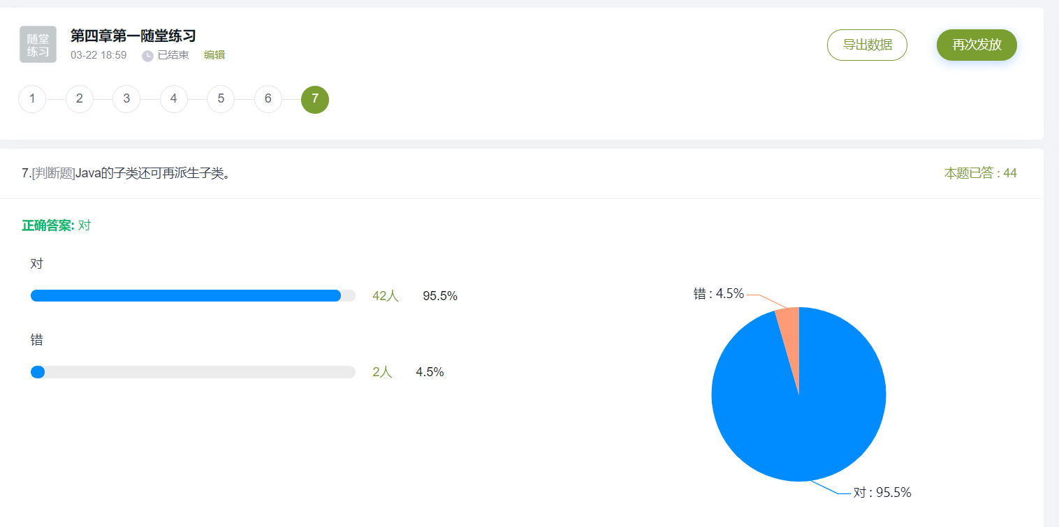 Java程序设计课程是Java系列课程的先修课,课程主要培养员工面向对象的编程思想和编程实践的能力。受疫情影响,本门课程从第3周开始改为线上授课方式。在线上授课过程中能运用信息技术透析整体线上教学过程,分析数据诊断学情,做到教学心中有“数”,同时在教学过程中依据学情及时优化教学方案,控制好线上教学课堂容量;追踪个案,分析差异,激发学习动力,落实个性分层教学;加强单元测试与作业等考核环节的设计,做到及时有效的作业反馈。确保疫情期间教学活动有质量的开展。