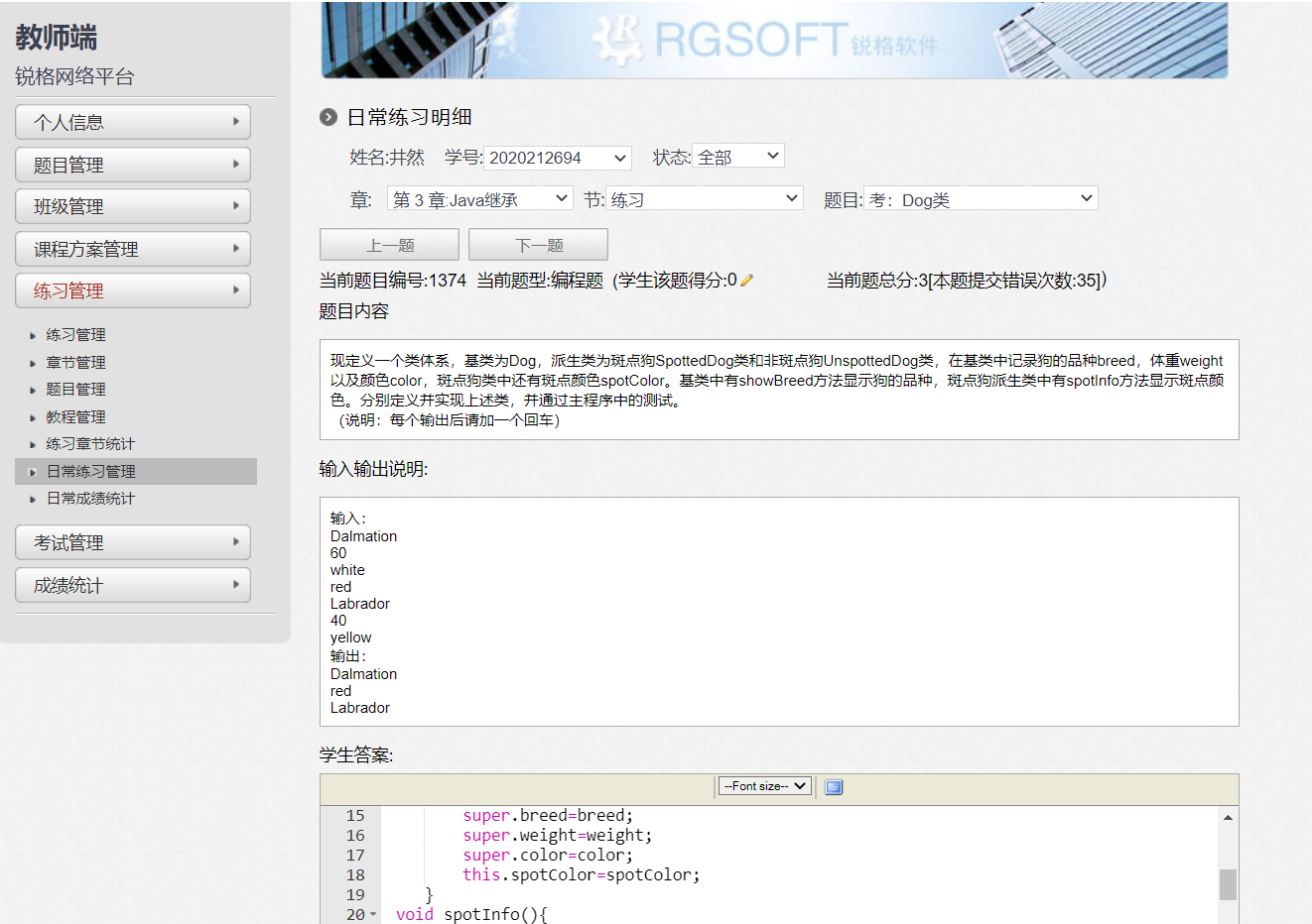(4)在课后利用公司的瑞格系统,布置相关程序练习题和实验,员工可线上提交代码,系统自动检测和运行代码,并及时提交结果反馈给员工。平台可有效的提高员工编程实践能力,同时根据统计了解员工编程完成情况。